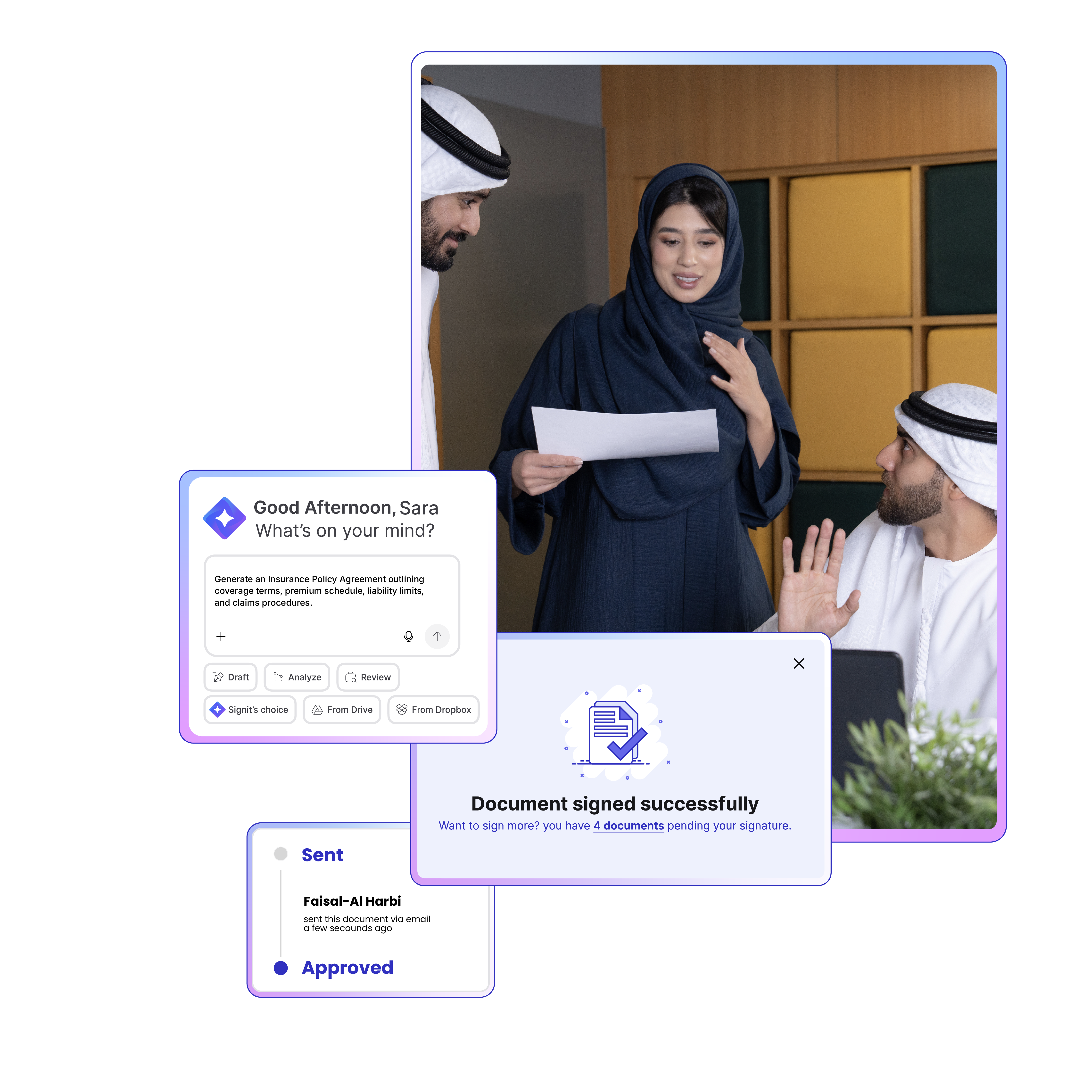 مكّن فرق التأمين لديك من صياغة وتوقيع وإدارة كل اتفاقية بأمان — من الوثائق إلى عقود الشركاء — مع امتثال سعودي كامل وتوقيعات إلكترونية ملزمة قانونياً.
