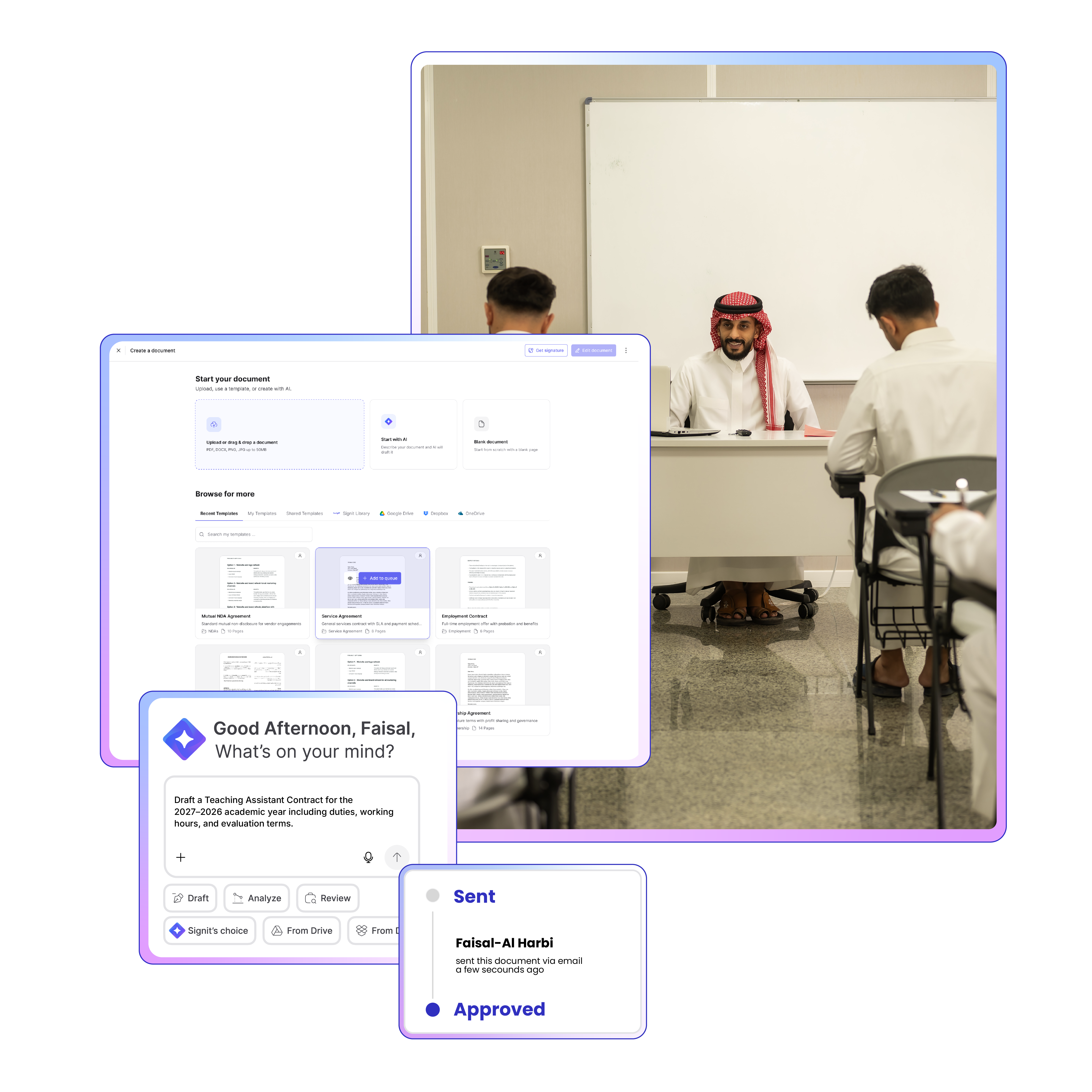احصل على توقيع الاتفاقيات رقمياً مع امتثال كامل وهويات موثقة.